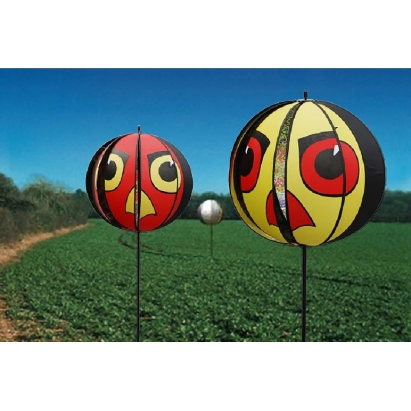 Stille vogelverschrikker, ideaal voor: Voederkuilen, balen, boomgaarden, gewassen, moestuinen e.d. Zeer opvallend door weerkaatsing, aangedreven door de wind, eenvoudig te monteren, weerbestendig, onderhoudsvrij.Tegen Ganzen, Kraaiachtigen, Duiven en Roofvogels.Niet voor spreeuwen, meeuwen en zangvogeltjes. Regelmatig verplaatsen en regelmatig van het land halen.Tegen ganzen 1-2 stuks per ha. Overig om de 20-40 meter te plaatsen.